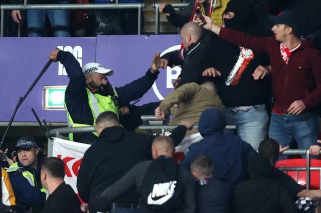 不过警察开场进入看台之后,一部分匈牙利球迷试图翻过铁丝栅栏,这次准备充分的英国警方迅速结成人墙,并动用警棍维持现场秩序。虽然这起插曲甚至并没有引起场上球员的注意,英格兰主帅索斯盖特也表示自己是赛后接受采访时才得知的消息,但现场的媒体仍然被搞得有些惊魂未定。BBC现场记者约翰·默里表示,看台上的骚乱贯穿了上半场的前半段时间:“大部分卷入骚乱的是一部分穿黑夹克的匈牙利球迷,你能看到他们似乎有着统一的装束,而直到上半场的前30分钟过后,看台上的局面才逐渐稳定下来。”